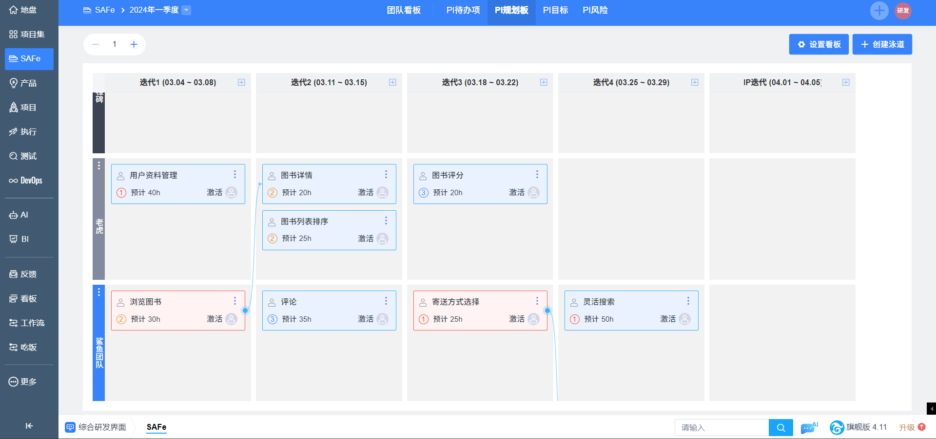 禅道提供了PI规划板,用于在PI规划会期间,可视化展示团队的需求和依赖关系。团队可以将需求和任务卡片放置在规划板上,以帮助协调和分配工作。