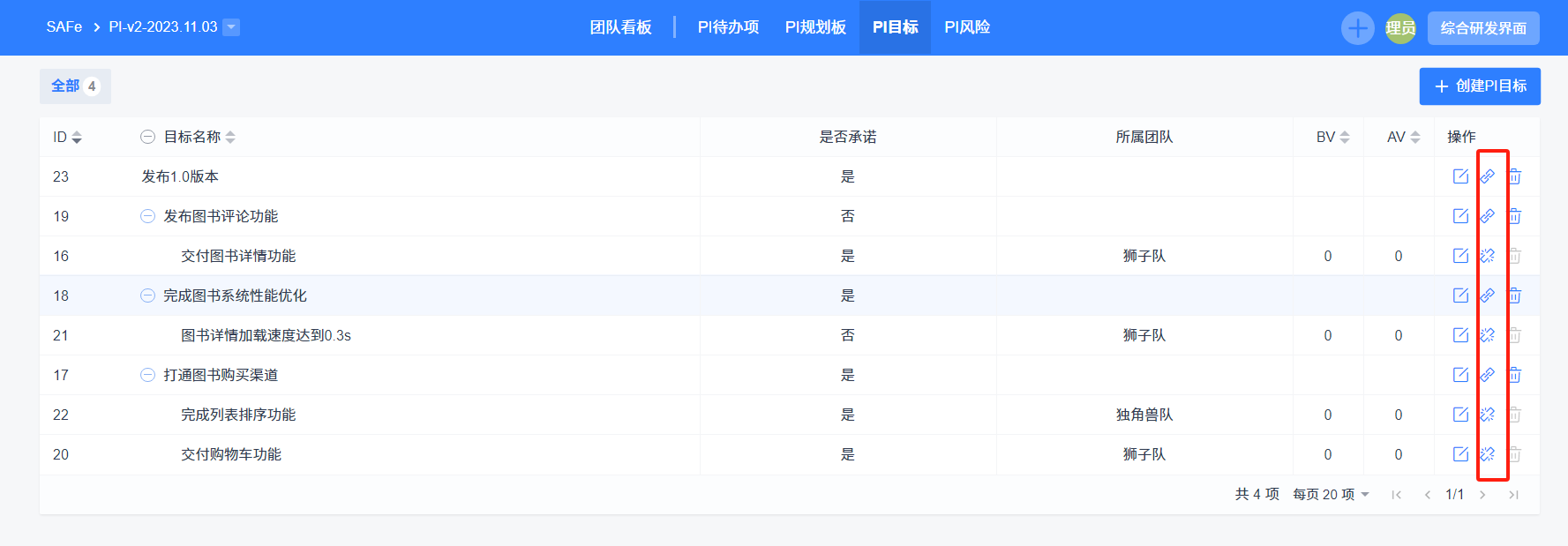 创建好PI目标后,点击关联按钮就可以关联团队中的目标。