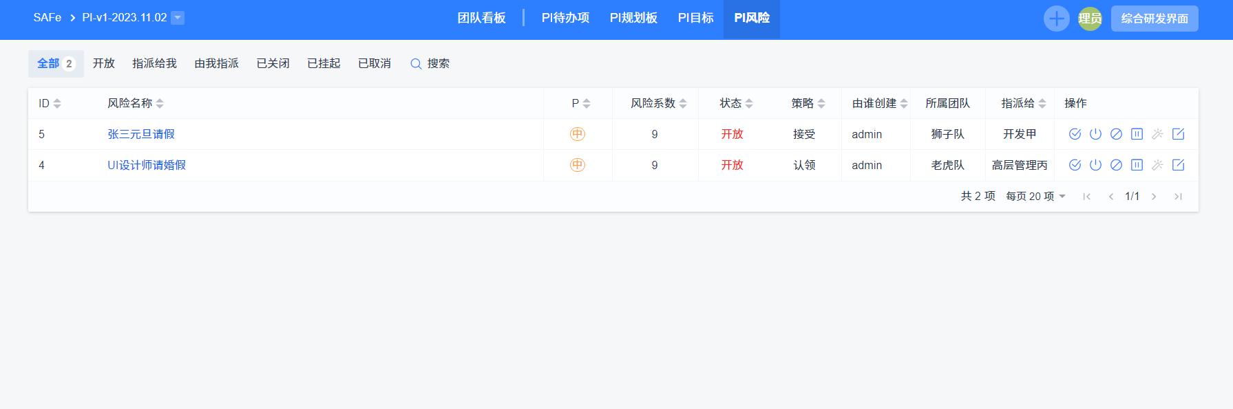 在PI风险列表,可以看到整个PI下的所有风险,展示所有团队看板上的风险信息,方便进行风险的跟进和管理。