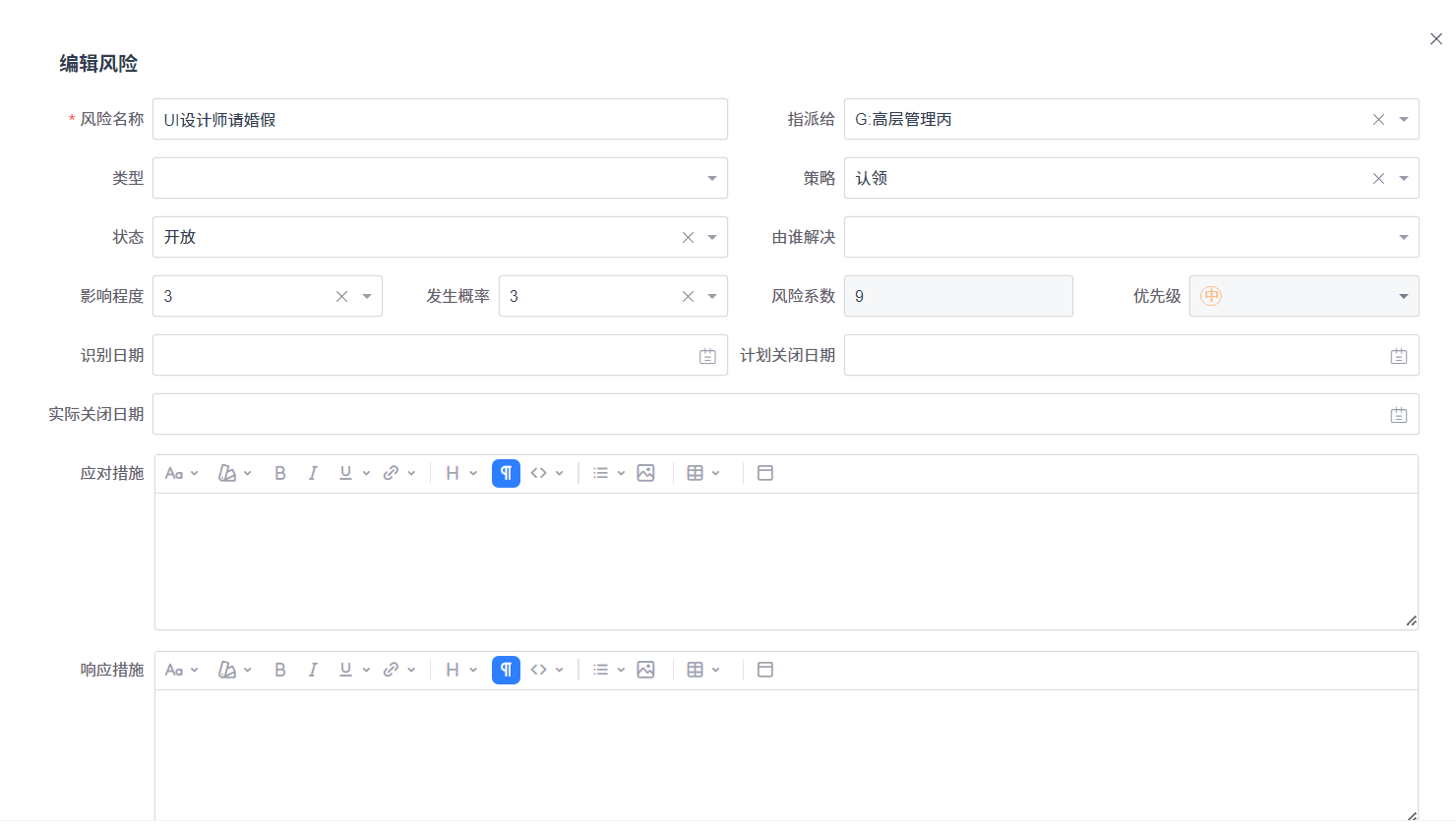风险策略、状态、指派信息有变化时,可以点击编辑按钮进行信息修改。