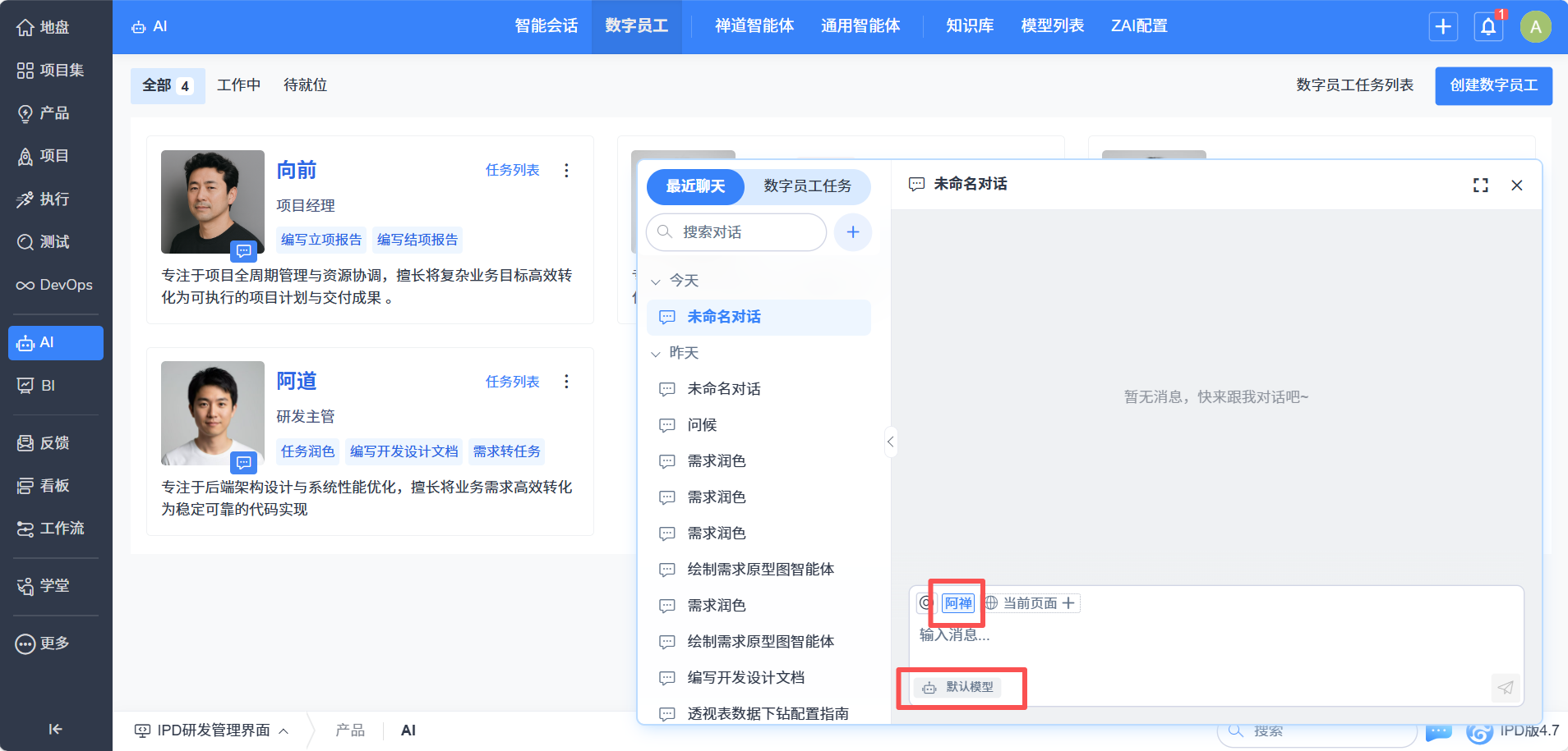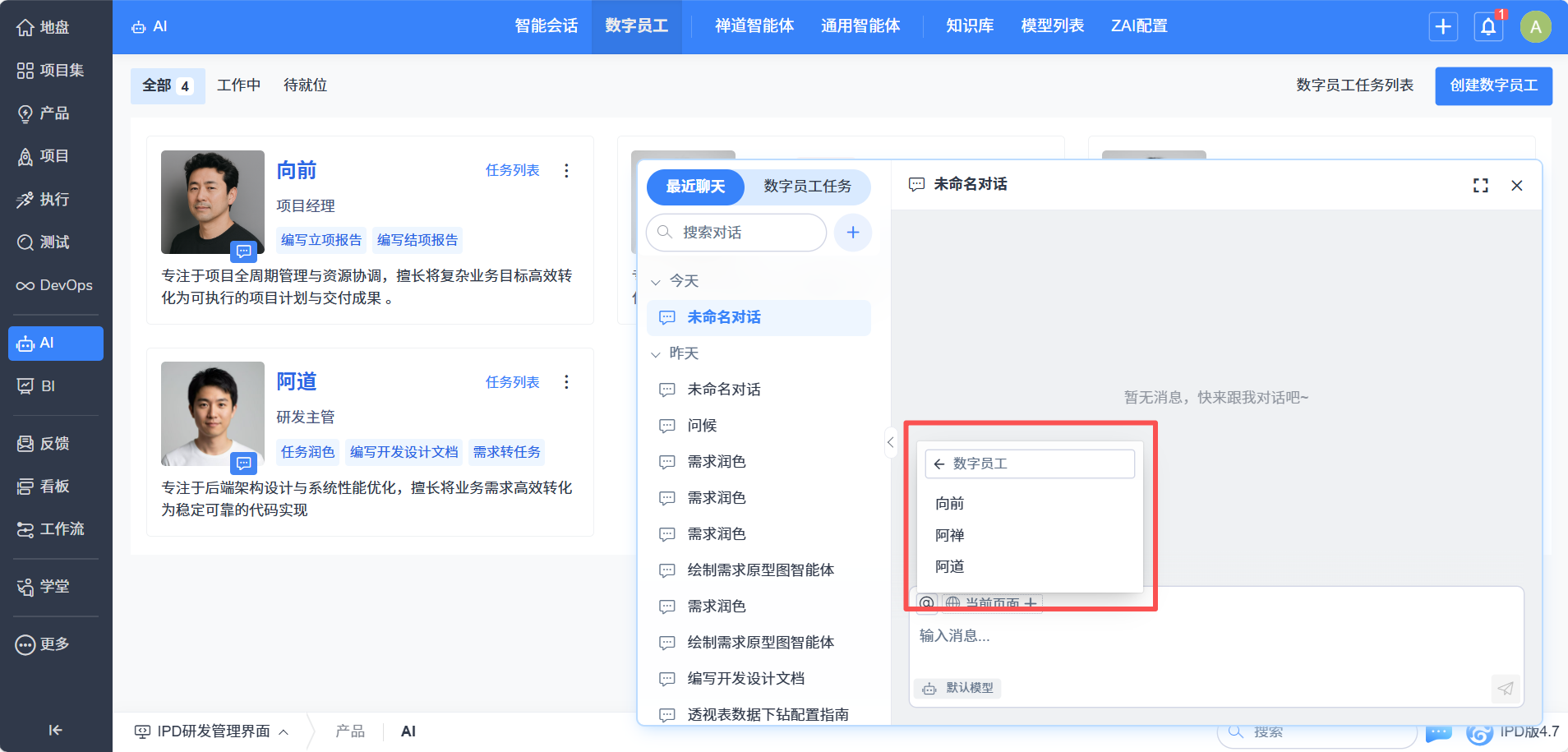 - 用户在会话中可直接与数字员工进行自然语言交流。
