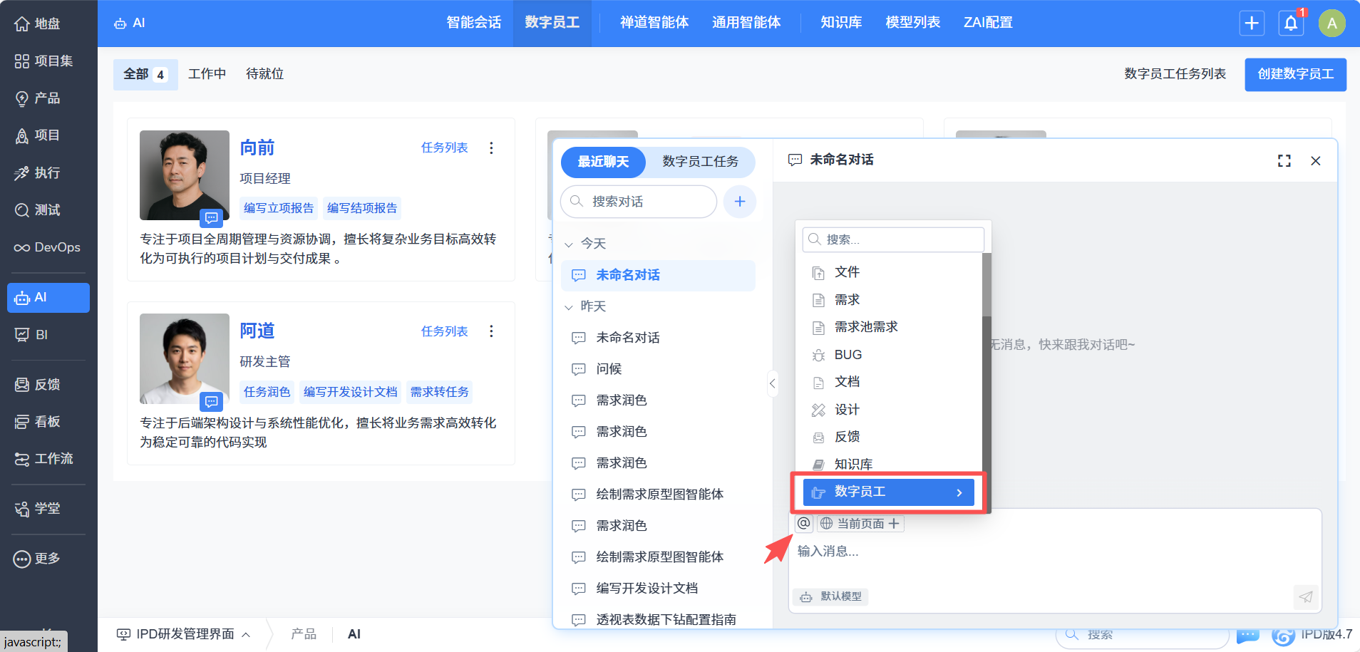 - 功能:点击“@”按钮,显示选择数字员工的菜单。