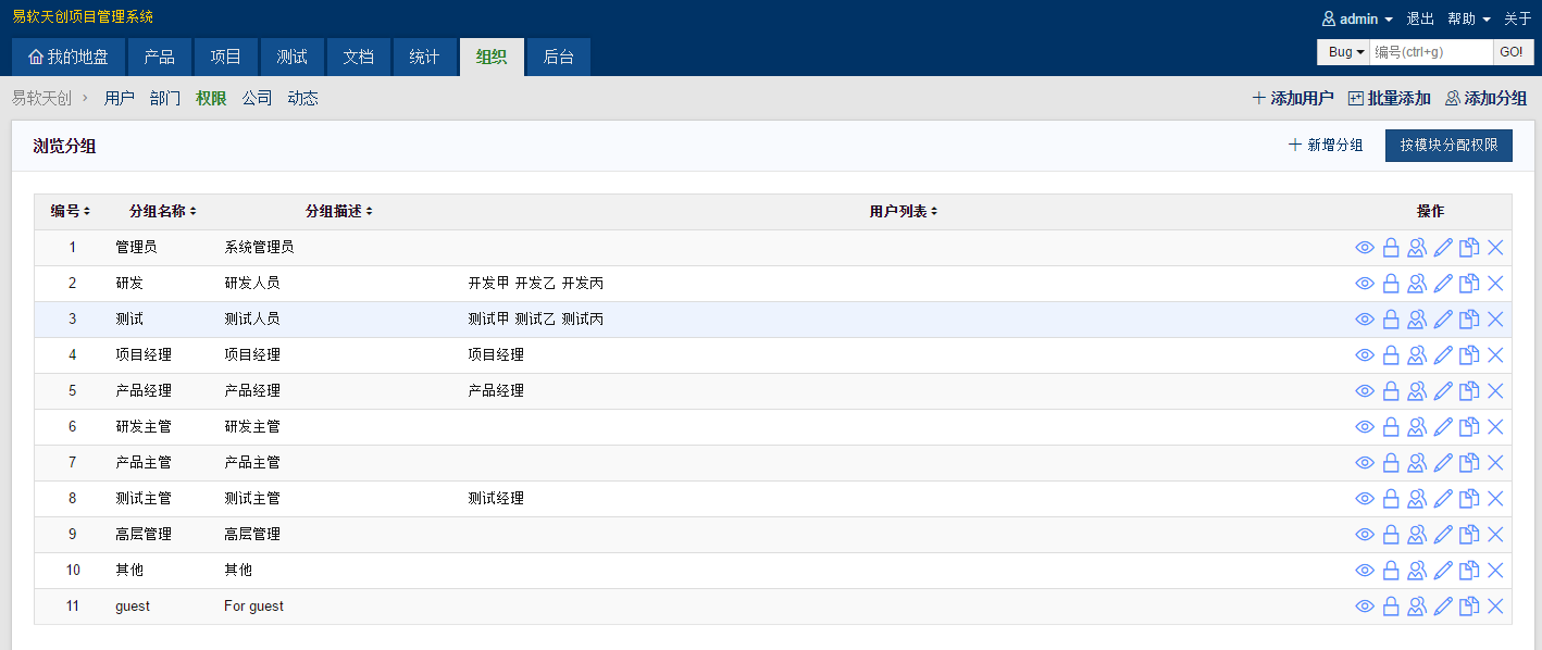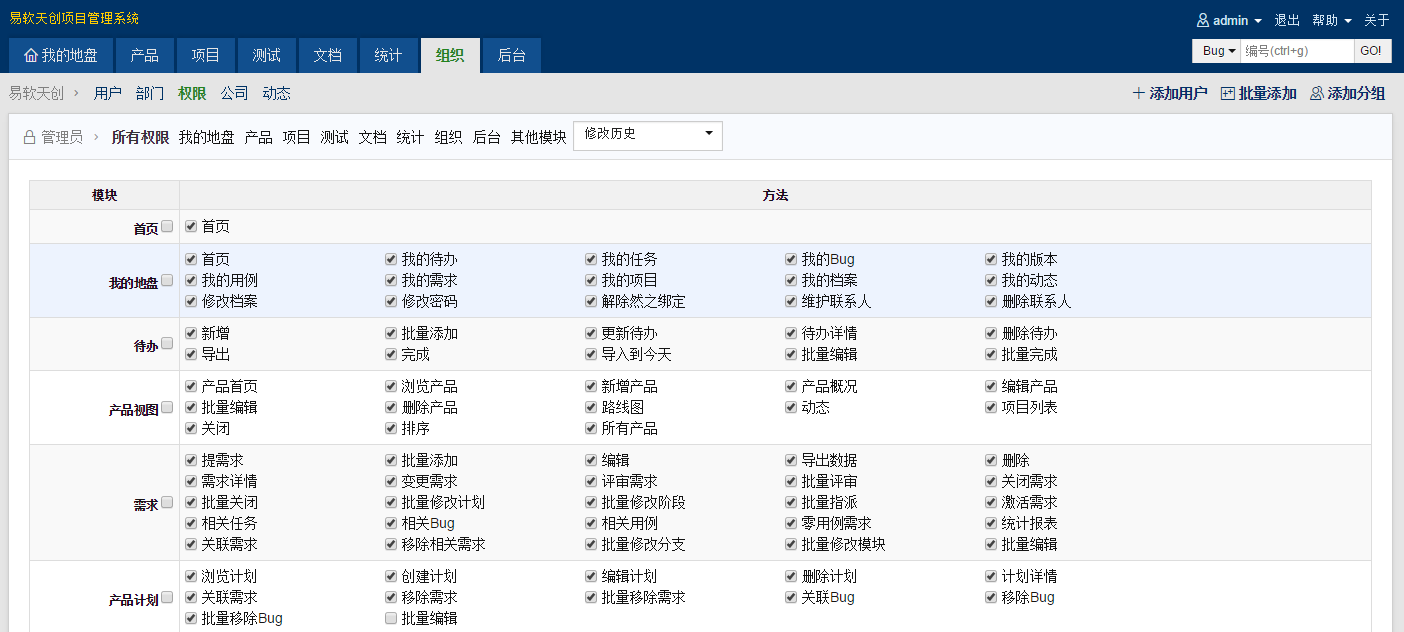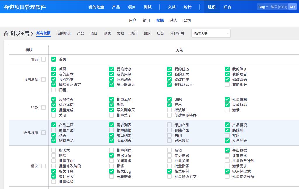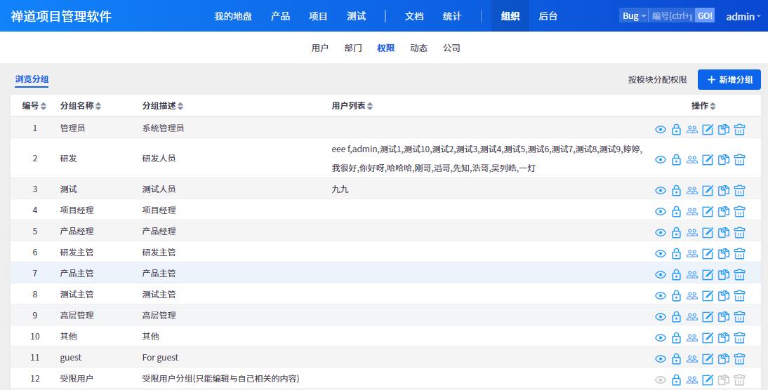 在禅道的开源版中,所有的控制(control)方法的权限都是通过在group/lang/resource.php进行分配控制的,(PS:默认所有的控制方法都是只有管理员可以访问),通过“组织=>权限”中的分配界面对每个用户进行访问权限的设置,如图。