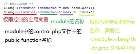 为了能够使自己新增的模块(module)或在现有模块的基础上新增的控制(control)方法能够在界面中显示并分配权限,则需要对module/group/lang/resource.php进行扩展,以下以对menudemo模块的index控制方法为例介绍具体操作。