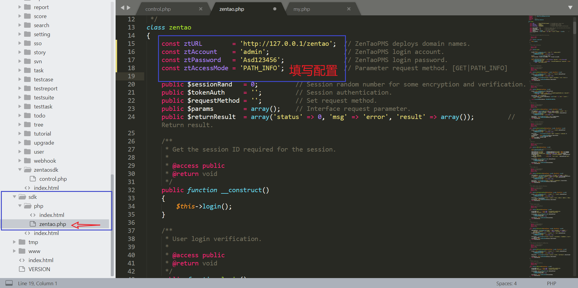 以开源版一键安装包为例,找到xampp\zentao\sdk\php\zentao.php文件,修改配置参数。