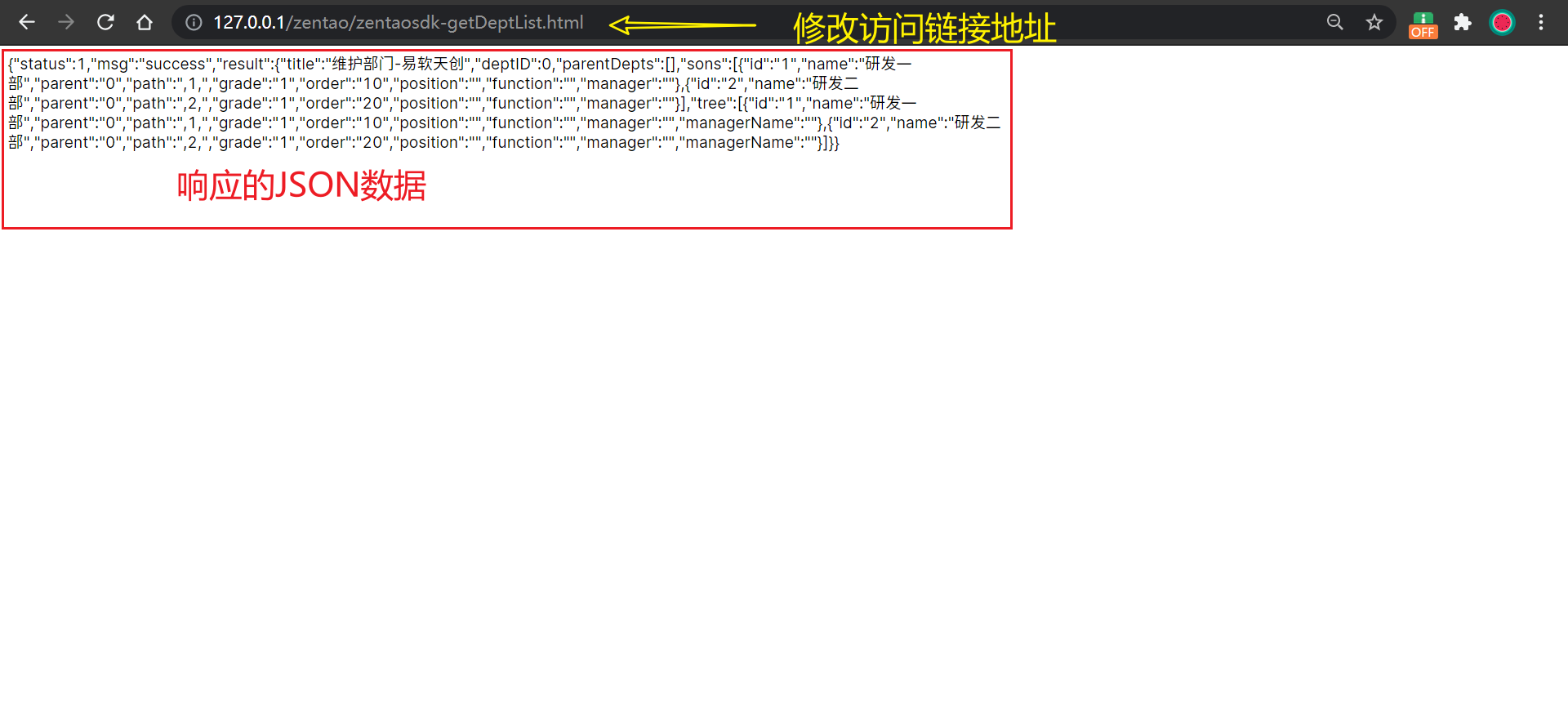 使用管理员账号登录禅道系统,登录系统后,修改URL地址,来访问创建的zentaosdk模块,测试我们的调用是否成功。