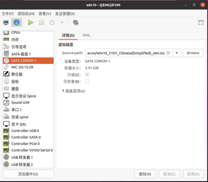 · 点击左下角添加硬件,增加一个光盘,指向下载的virtio驱动;