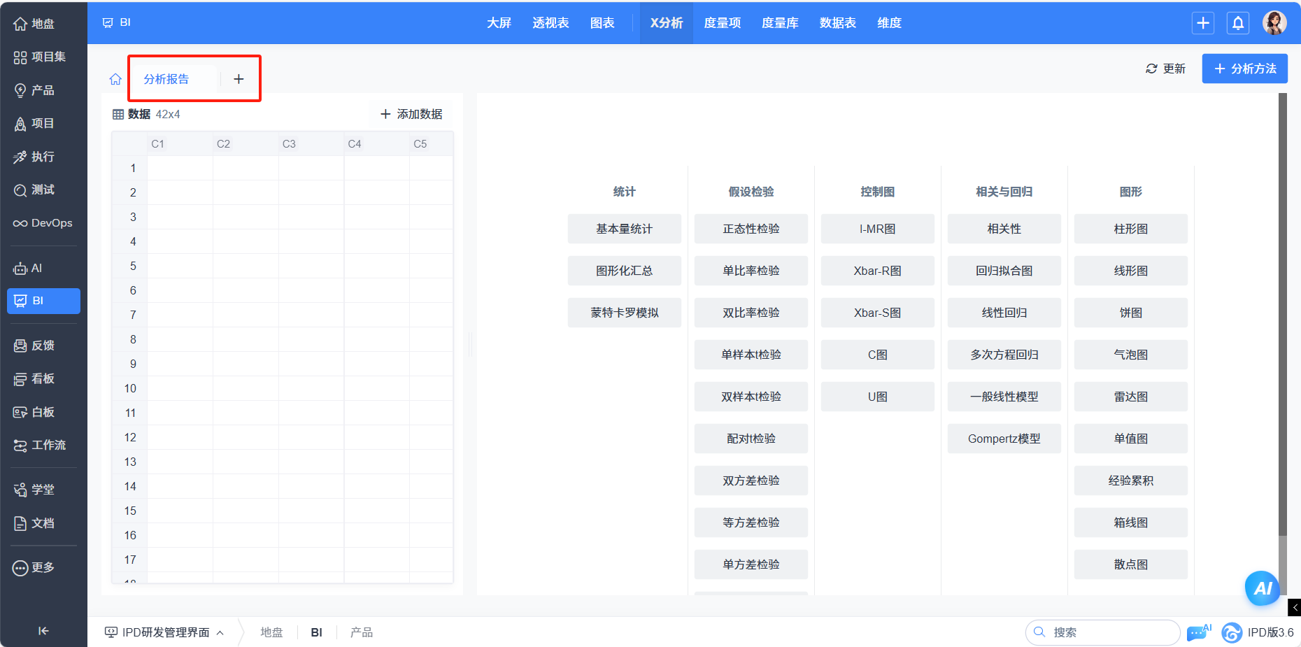 分析报告是分析过程中的结果呈现。一个分析报告中可以包含多个分析。当创建分析项目时,如果还没有任何分析方案则会自动创建一个默认的分析报告。