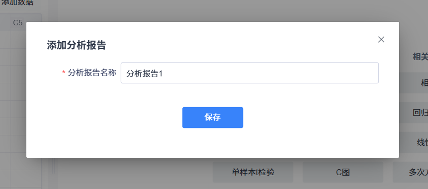 在添加分析报告对话框中填写分析报告名称,点击“保存”按钮即可创建一个分析报告。
