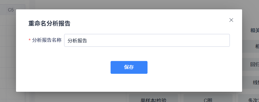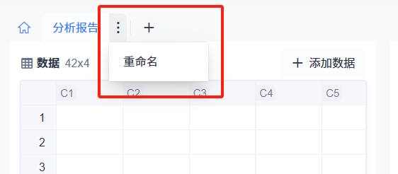 将鼠标悬停在分析报告名称上,右侧会显示更多操作按钮,鼠标继续悬停在更多操作按钮上时会显示“更多操作”菜单,点击菜单上的“重命名”菜单项即可打开重命名对话框,可对分析方案进行重命名操作。