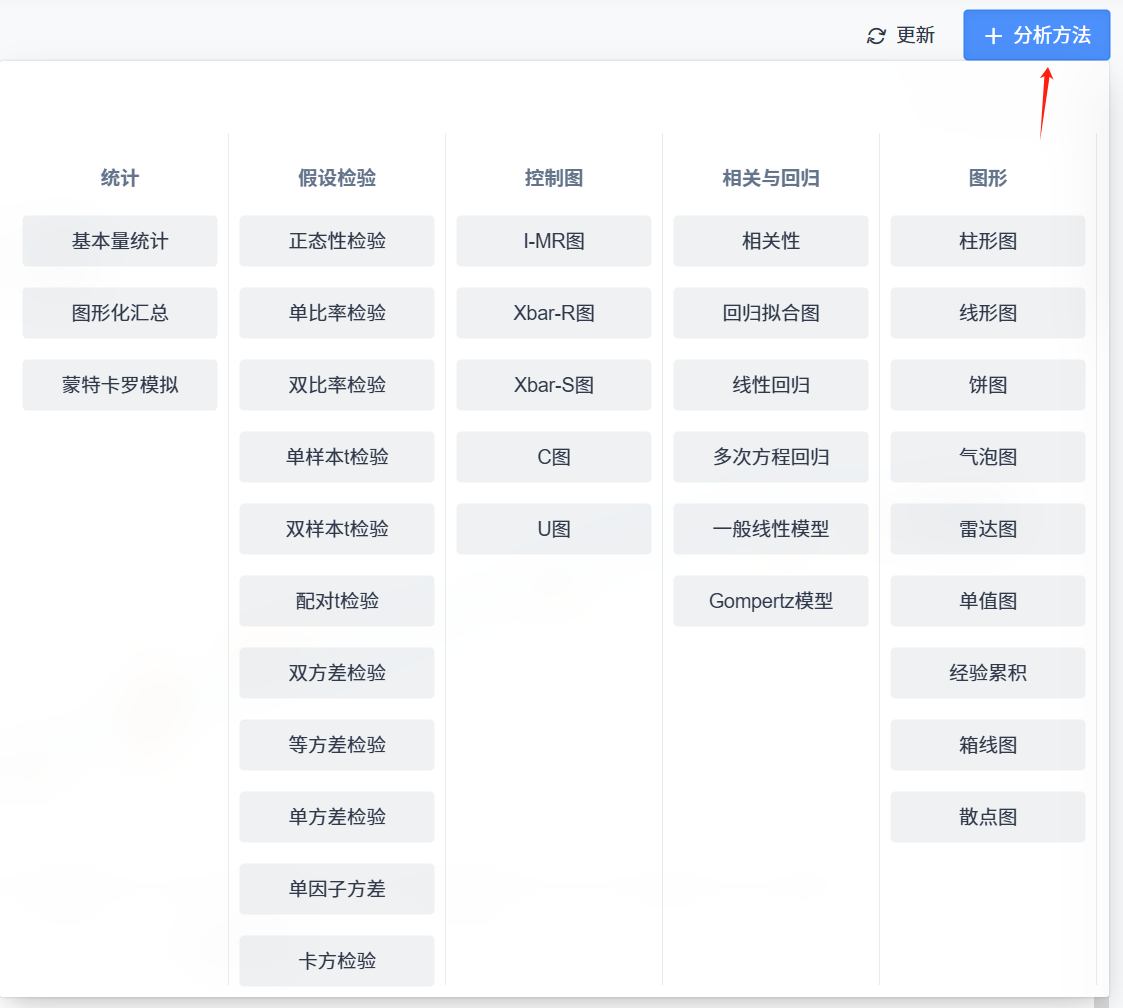 当分析报告中已有分析方法时,会在页面右上角显示“添加分析方法”按钮,鼠标悬停在按钮上会显示“分析方法添加”菜单,点击菜单上的分析方法按钮即可打开“分析方法添加”对话框进行添加。