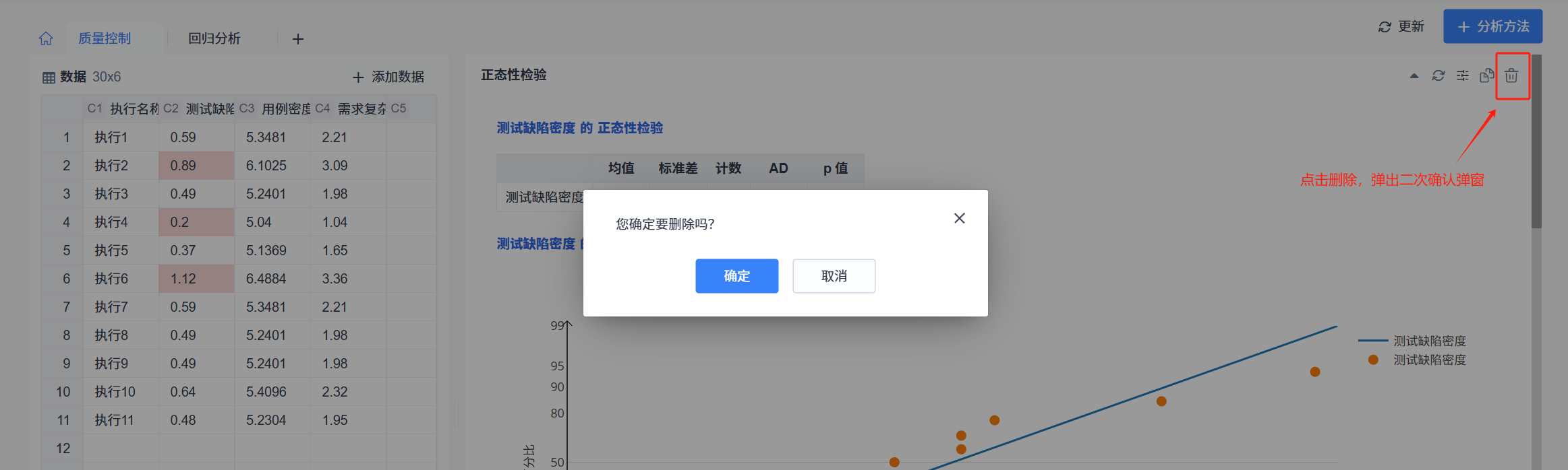 点击分析方法结果面板标题右侧的“删除”按钮,系统会提示进行删除操作确认,点击确认后即可删除分析方法结果。