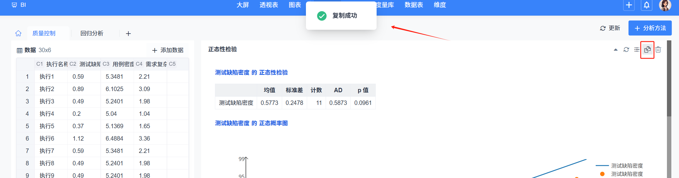 点击分析结果面板标题右侧的“复制”按钮,即可对分析结果进行复制,同时系统会进行“复制成功”的提示。