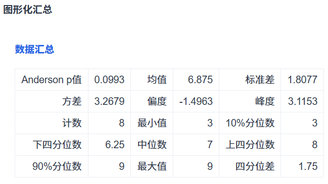- 统计计算:包括 Anderson p 值、计数、求和、均值、方差、最大值、最小值、中位数、下四分位、上四分位、10% 分位、90% 分位、标准差、偏度和峰度。