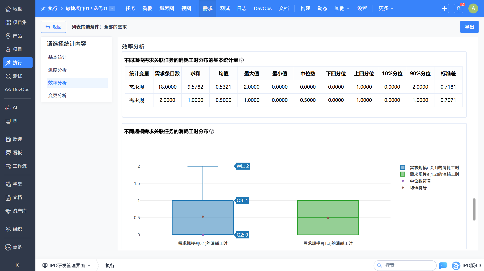 在这一部分,您将了解到需求在不同阶段的停留时间,帮助您识别迭代中时间消耗的主要环节。需求各阶段的停留时间是根据其关联任务的状态变化计算而来。您可以查看基本统计量,或通过箱线图直观了解不同阶段停留时间的差异和数据分布。