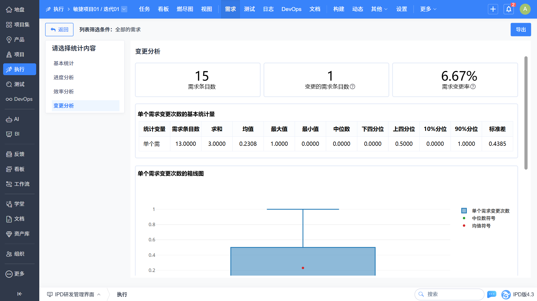 这项分析将帮助您清晰了解每个需求在迭代过程中的变更情况。您可以查看基本统计量,或者通过箱线图直观地了解需求变更的分布情况,让信息一目了然!