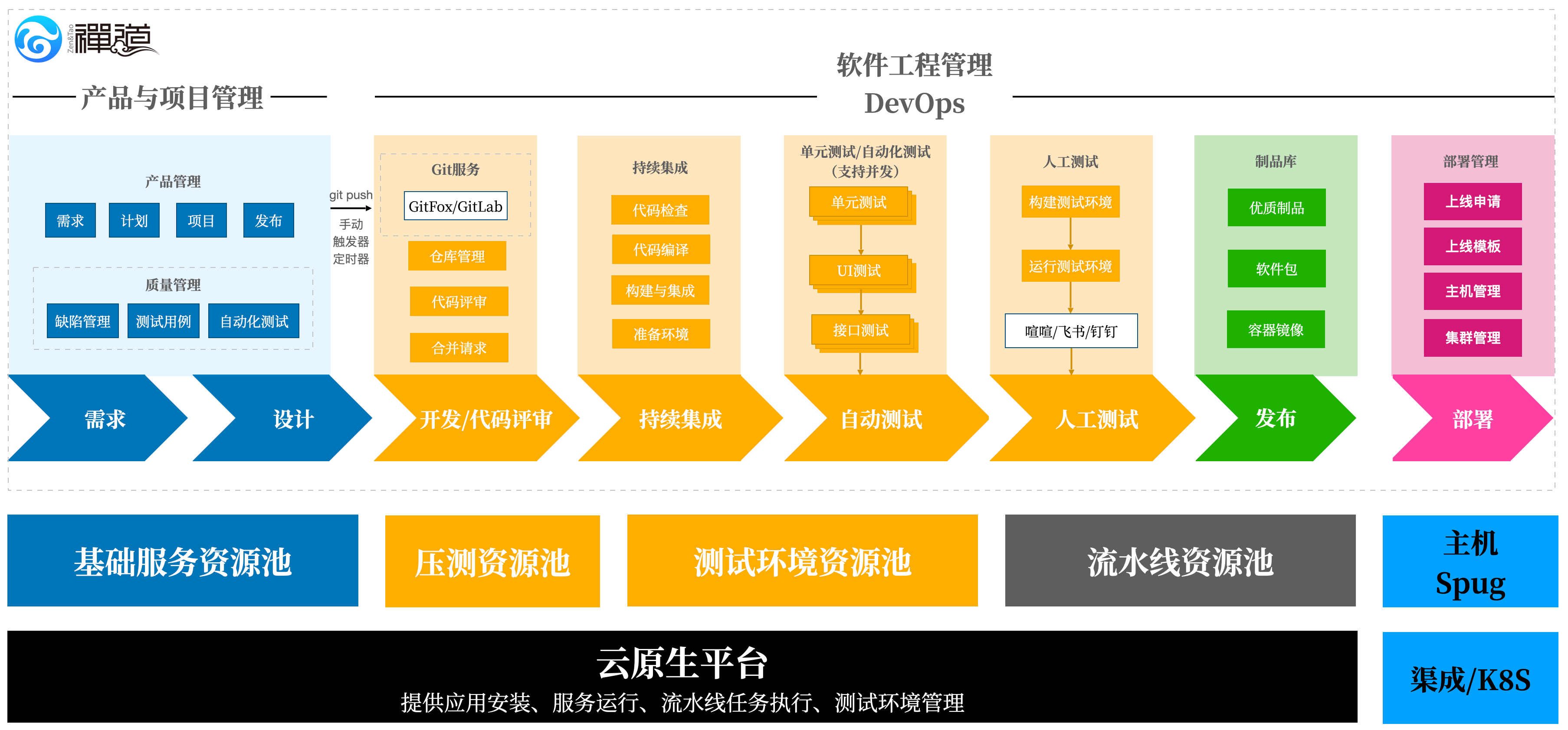 依托于禅道十几年的项目管理、研发管理与运营经验,在支持Scrum项目、瀑布项目、融合项目(Scrum+瀑布)以及 IPD流程管理的背景下,拓展了技术工程侧的支持,基于DevOps模型,融合云原生技术,打通了从产品、项目、技术的全链路、持续迭代的平台解决方案。