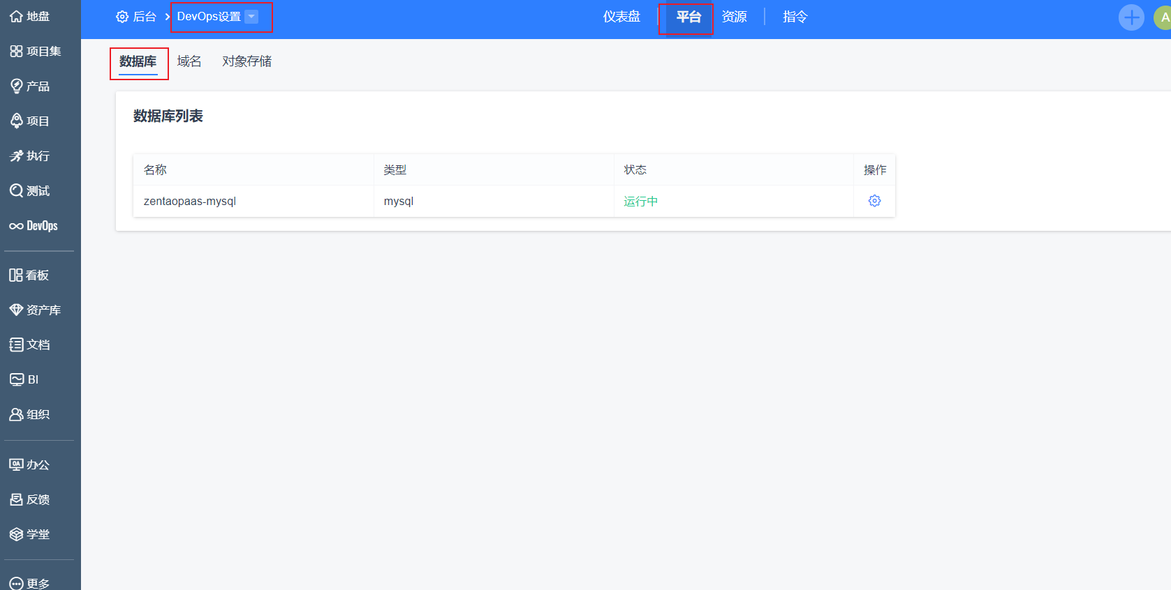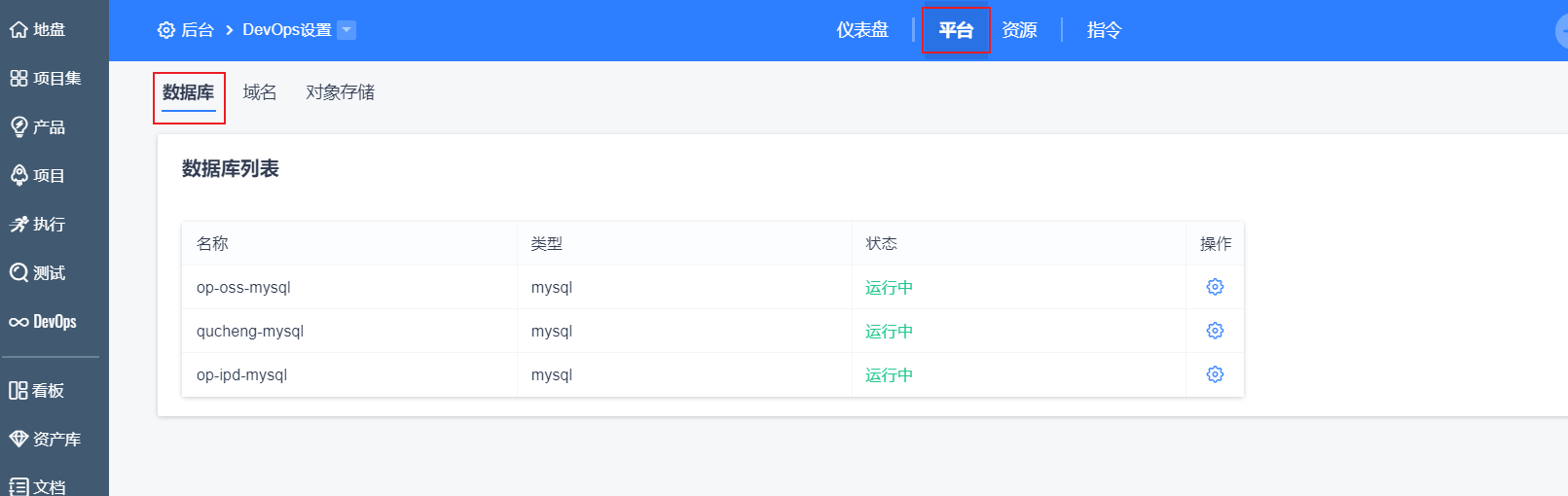 用户进入DevOps菜单后,点击配置-平台-数据库,可以查看所有的数据库列表。