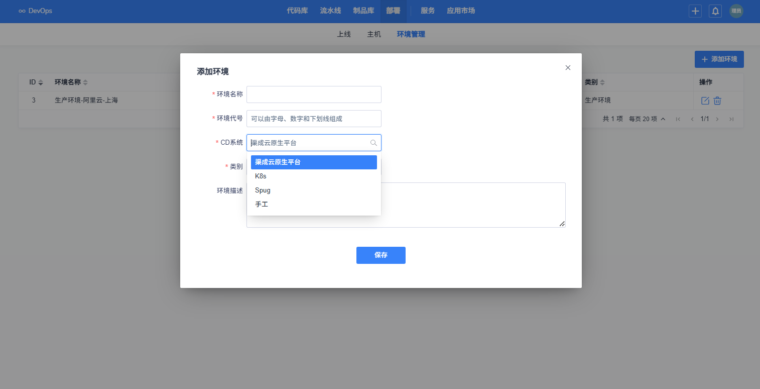 平台支持多种类型的环境管理,CD系统类型有:渠成云原生平台、K8s、Spug、手工。其中Spug类型的环境创建后会同步到Spug应用。