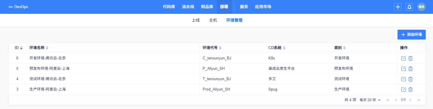 点击DevOps导航中的部署菜单,然后点击三级导航中的环境进入环境列表。