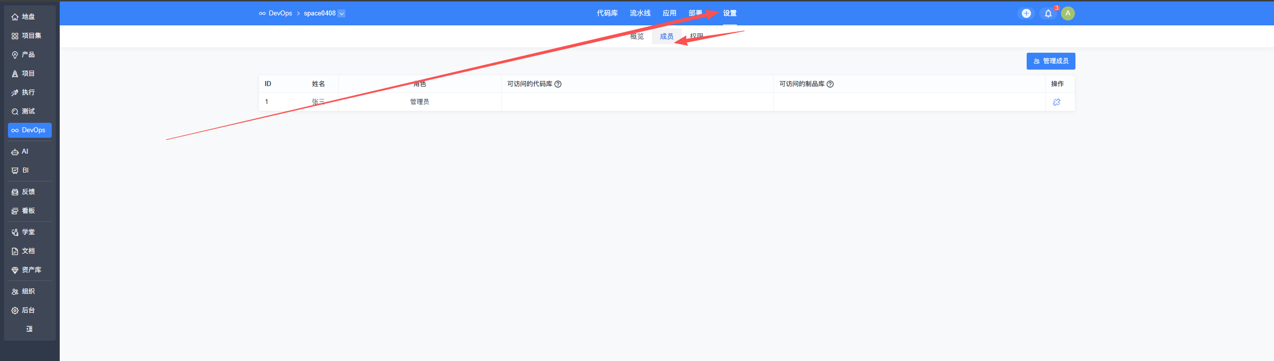 进入空间后,点击顶部“设置”模块,然后点击“成员”菜单,即可设置空间成员。