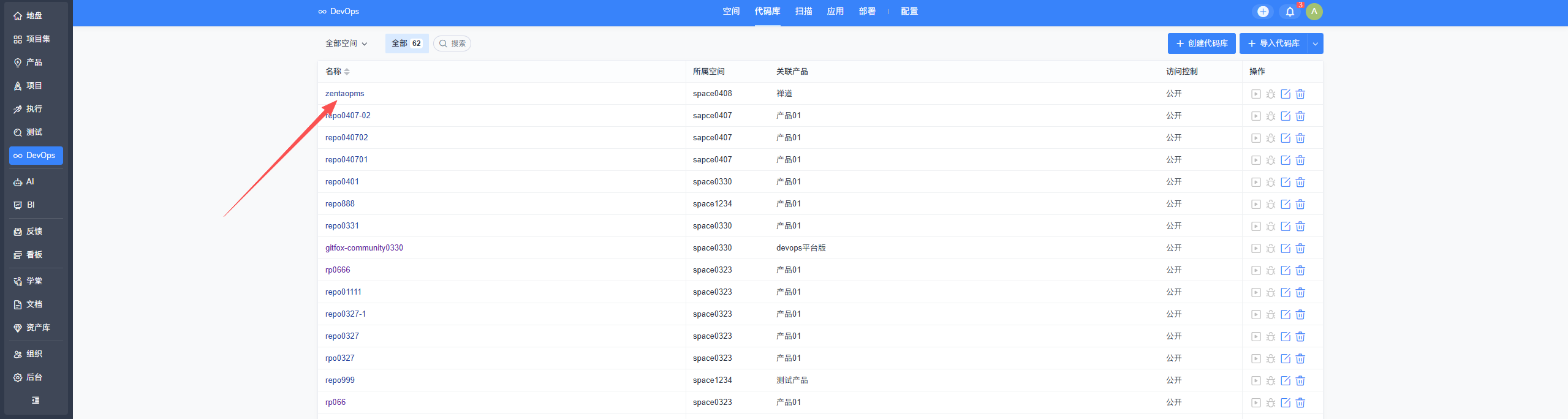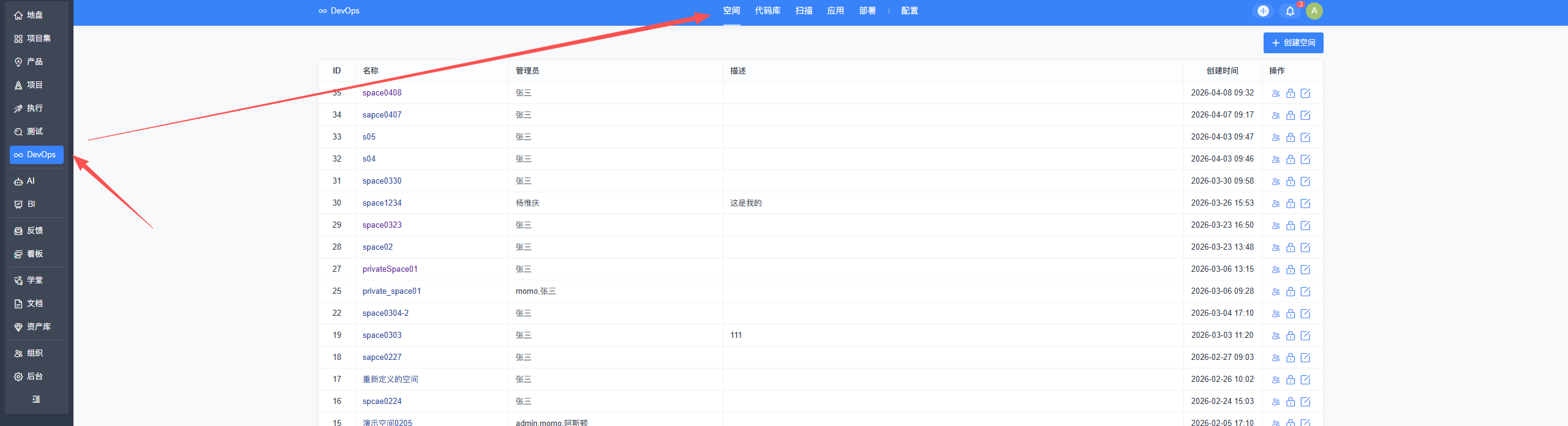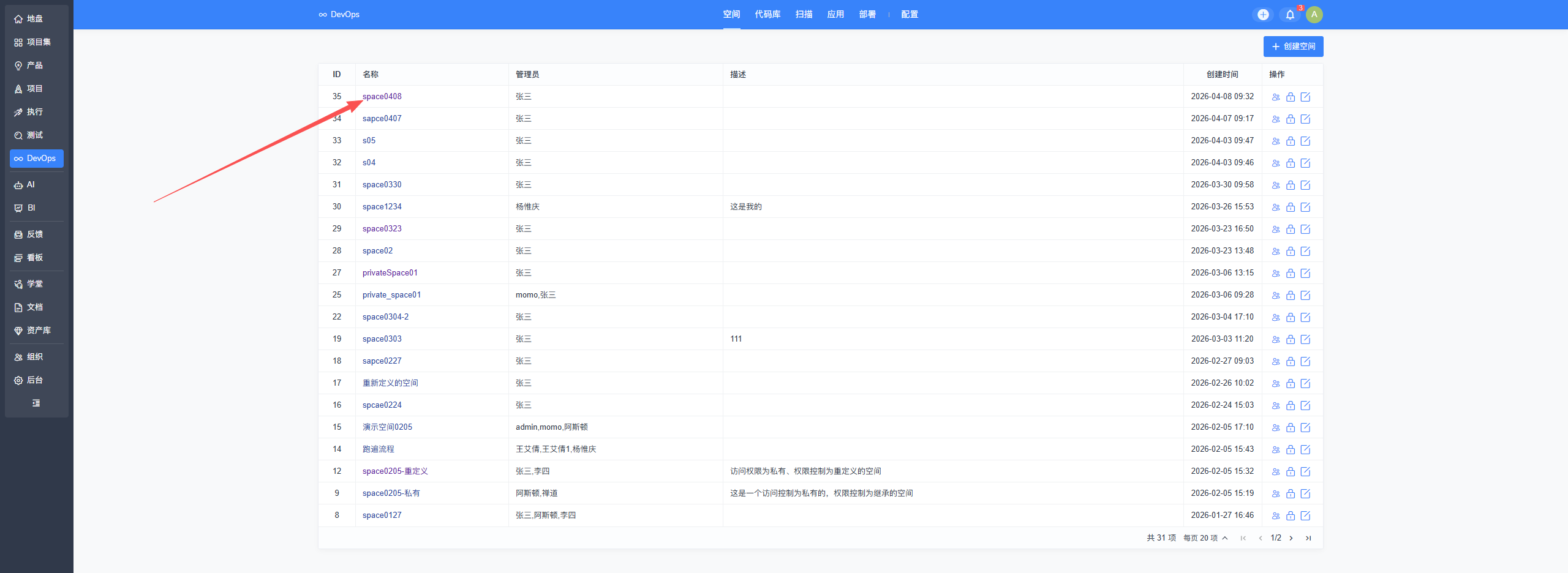 进入DevOps,点击顶部空间菜单,即可进入空间列表。