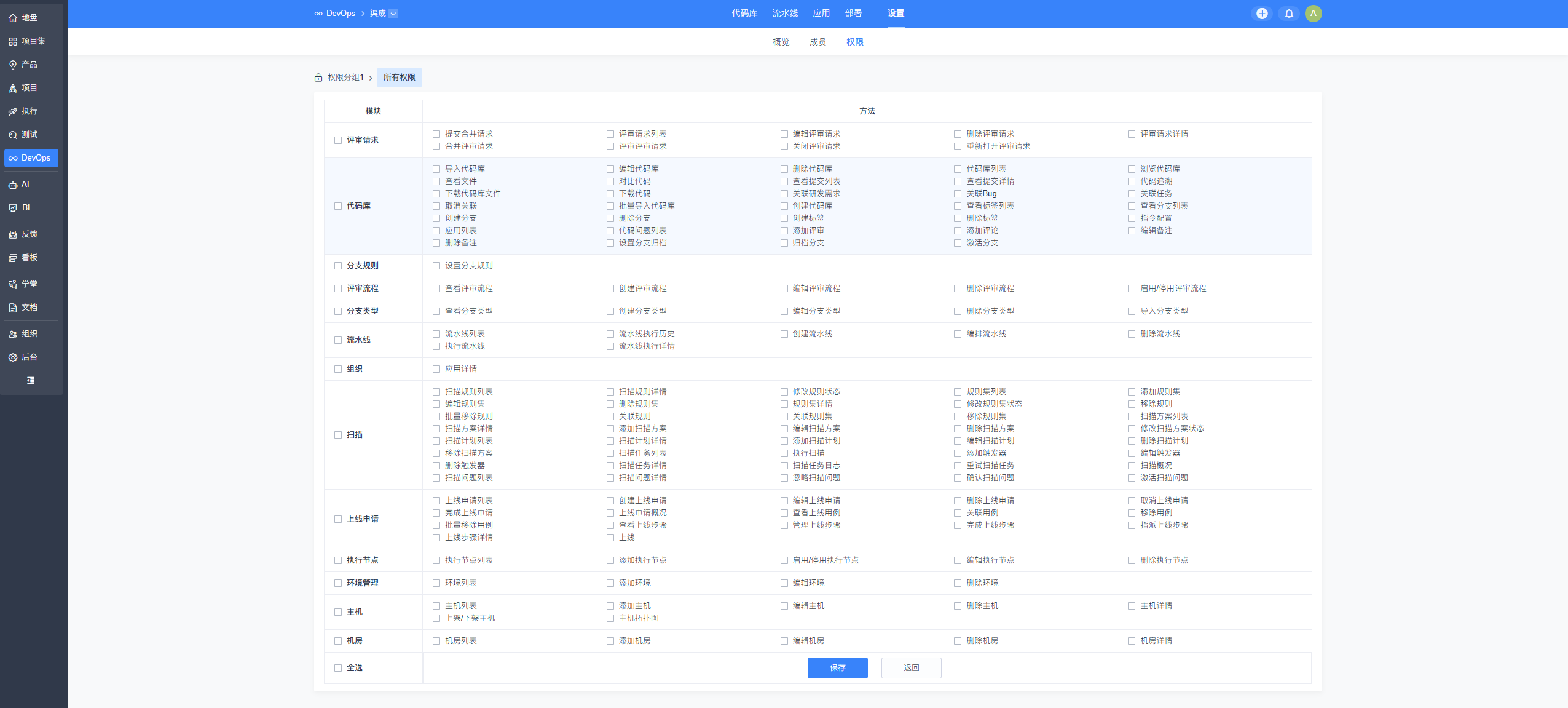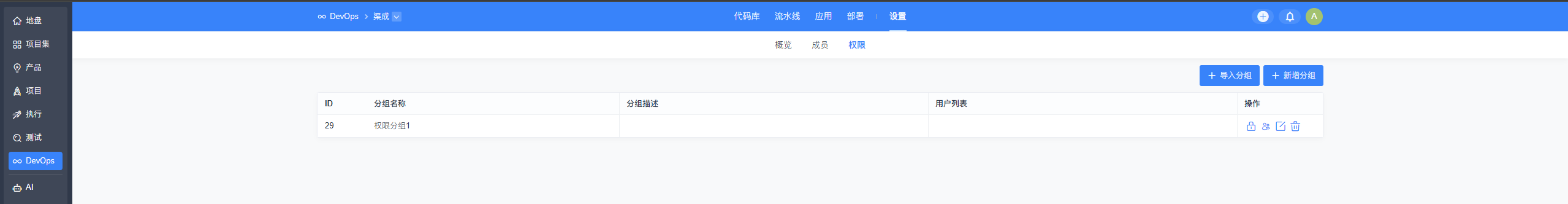 点击顶部“设置”模块,然后点击“权限”菜单,即可设置权限分组。