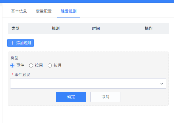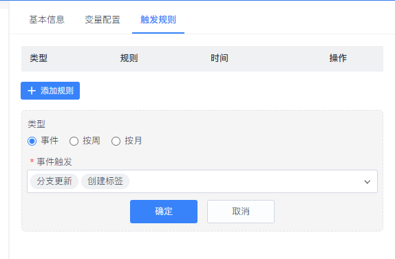 系统支持按照事件触发(仅代码库下流水线)、按周定时触发、按月定时触发。