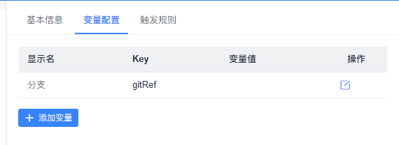切换到变量配置选项卡,可配置流水线运行时的全局变量。代码库层级的流水线,会默认包含“分支”变量,用于指定运行时的分支。