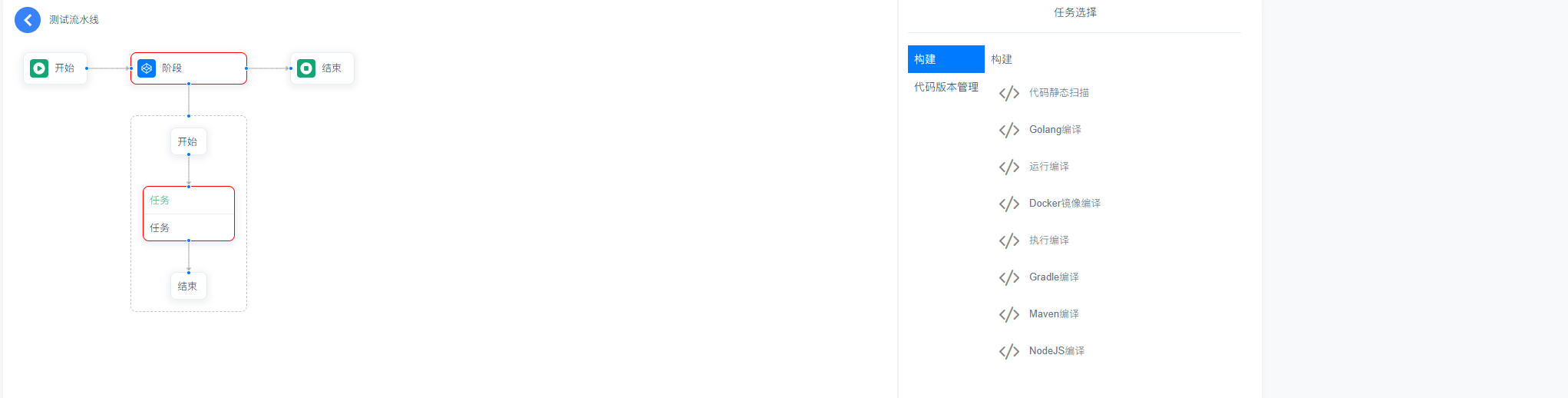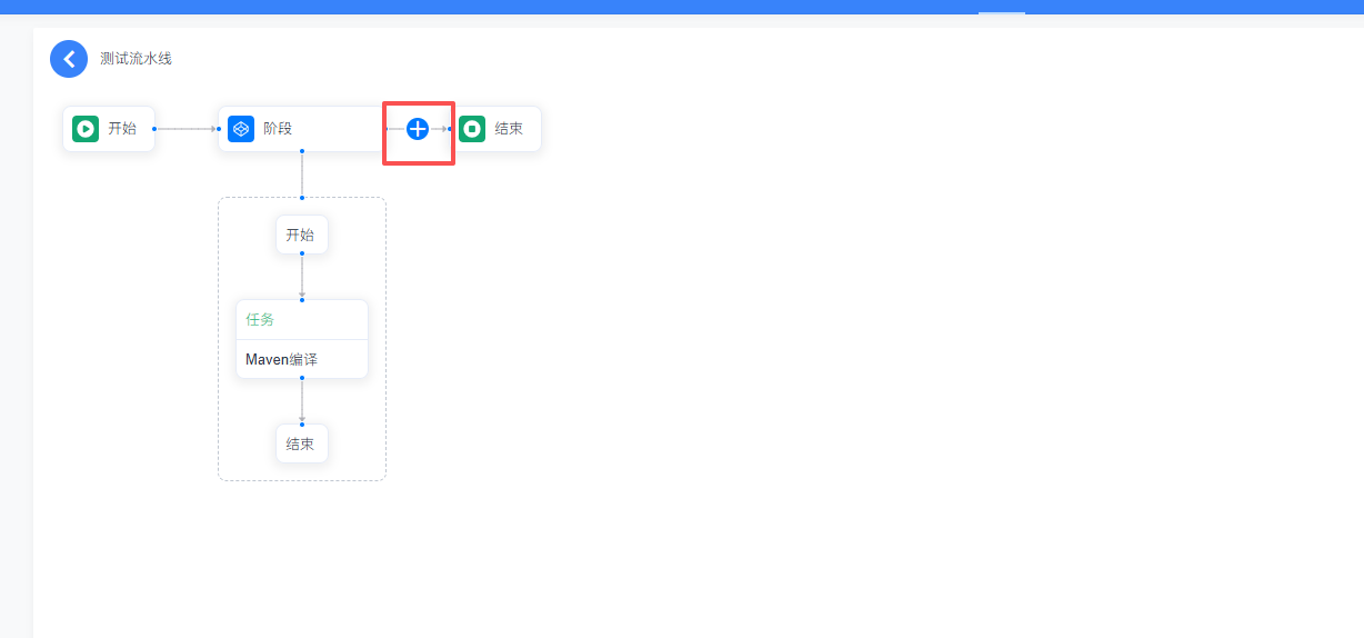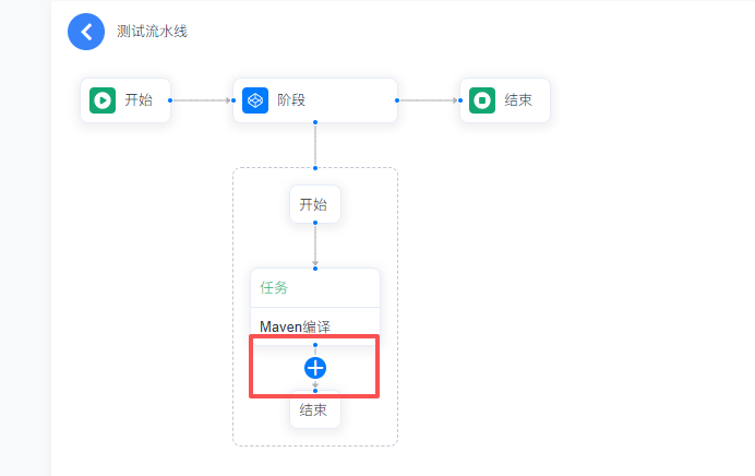 进入流水线编排页面后,左侧为流水线画板区域,鼠标悬停在开始和结束中间的连接线上,会出现加号,点击加号即可增加阶段。在右侧弹窗中可修改阶段名称,阶段添加完成后会自动创建一个任务。