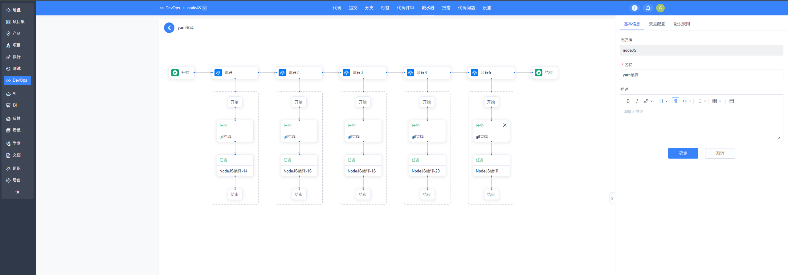 流水线创建完成后,或在列表页点击编排按钮,会进入流水线编排页面,可以在编排页面配置流水线参数。