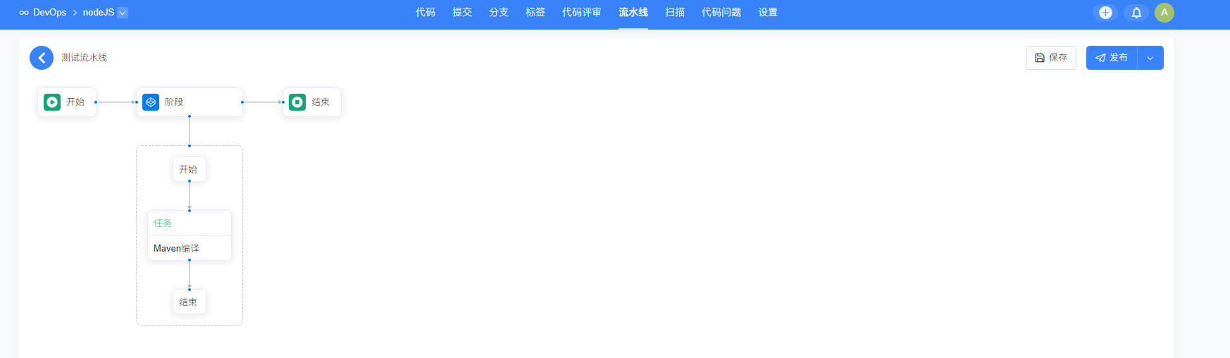 流水线编排完成后,可以点击右上角保存按钮,将流水线保存为草稿状态。草稿状态的流水线不支持运行。