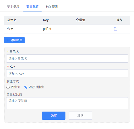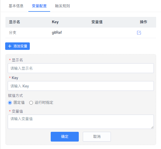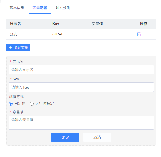 赋值方式:分为固定值和运行时指定。若选择运行时指定,则手动触发流水线时,系统会弹出弹窗,要求使用者输入变量值。当流水线通过自动化触发时,系统会采用下方默认变量值的内容。