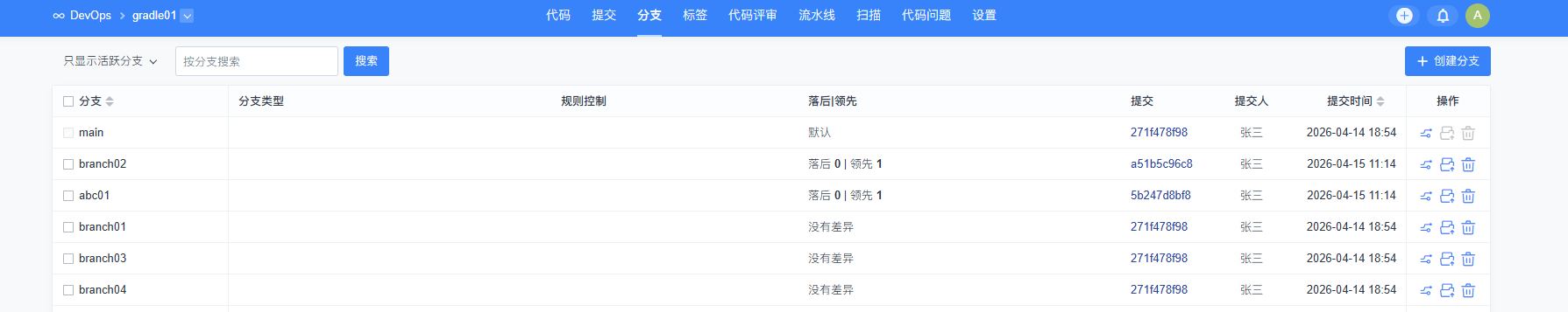 拥有权限的用户,也可以点击创建分支按钮,创建新的分支。