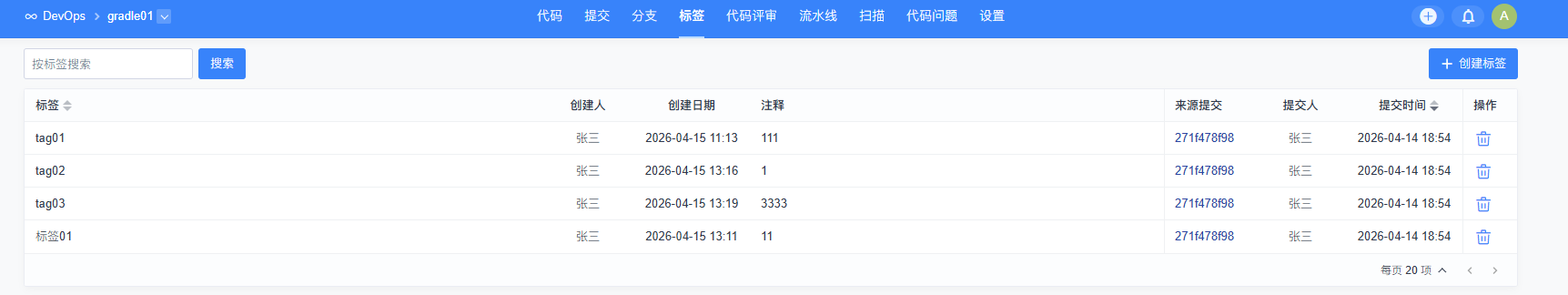 点击代码库上方的 标签菜单,查看代码库下的标签信息。