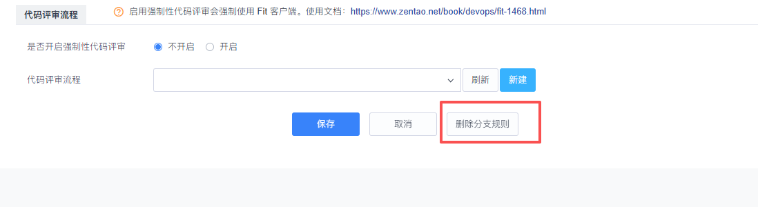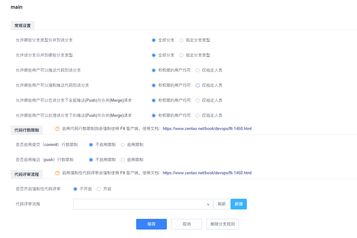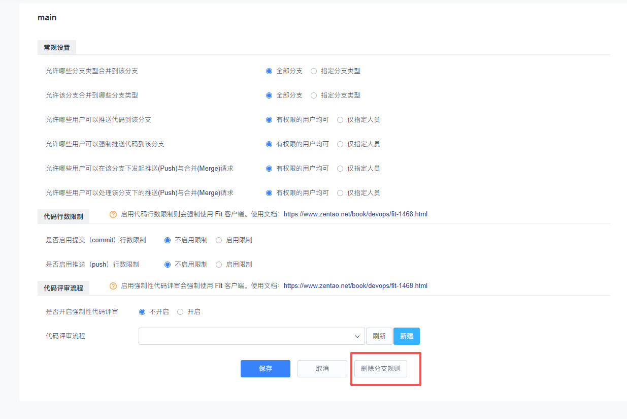 点击分支规则页面的删除分支规则按钮,即可将分支规则设置为默认状态(拥有最大权限)。