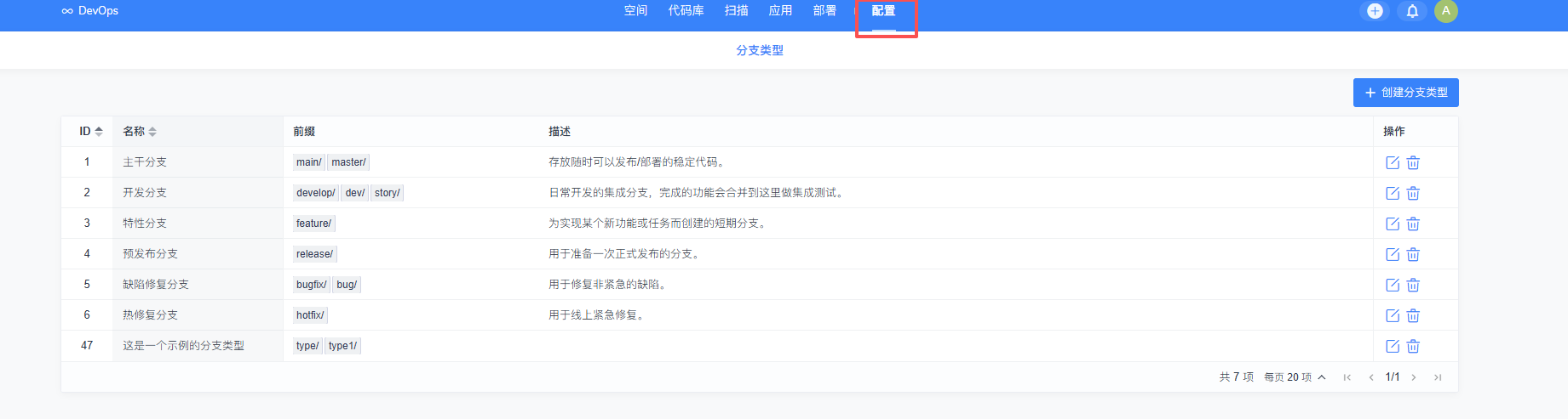 有权限的用户,可以在DevOps-配置-分支类型中,配置分支类型模板,以供在代码库下一键导入。