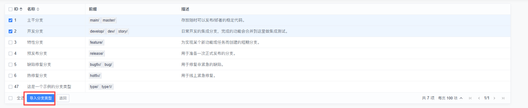 勾选需要导入的分支类型,然后点击导入分支类型。