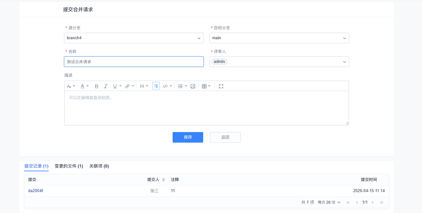 点击保存,即可创建合并请求。