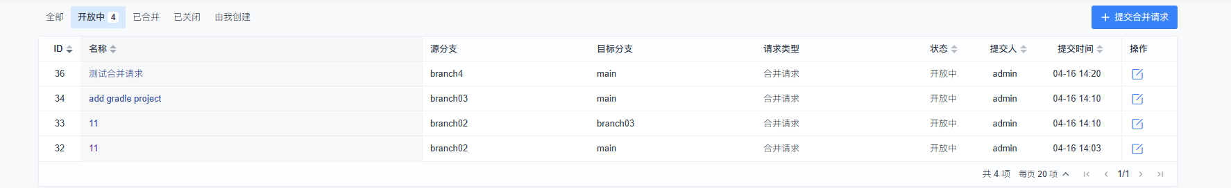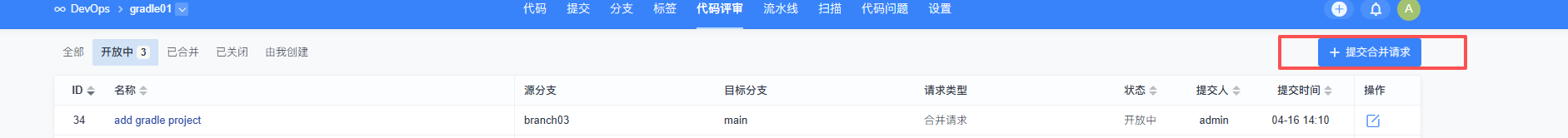 在代码评审列表页面,可以看到刚刚创建的合并请求。