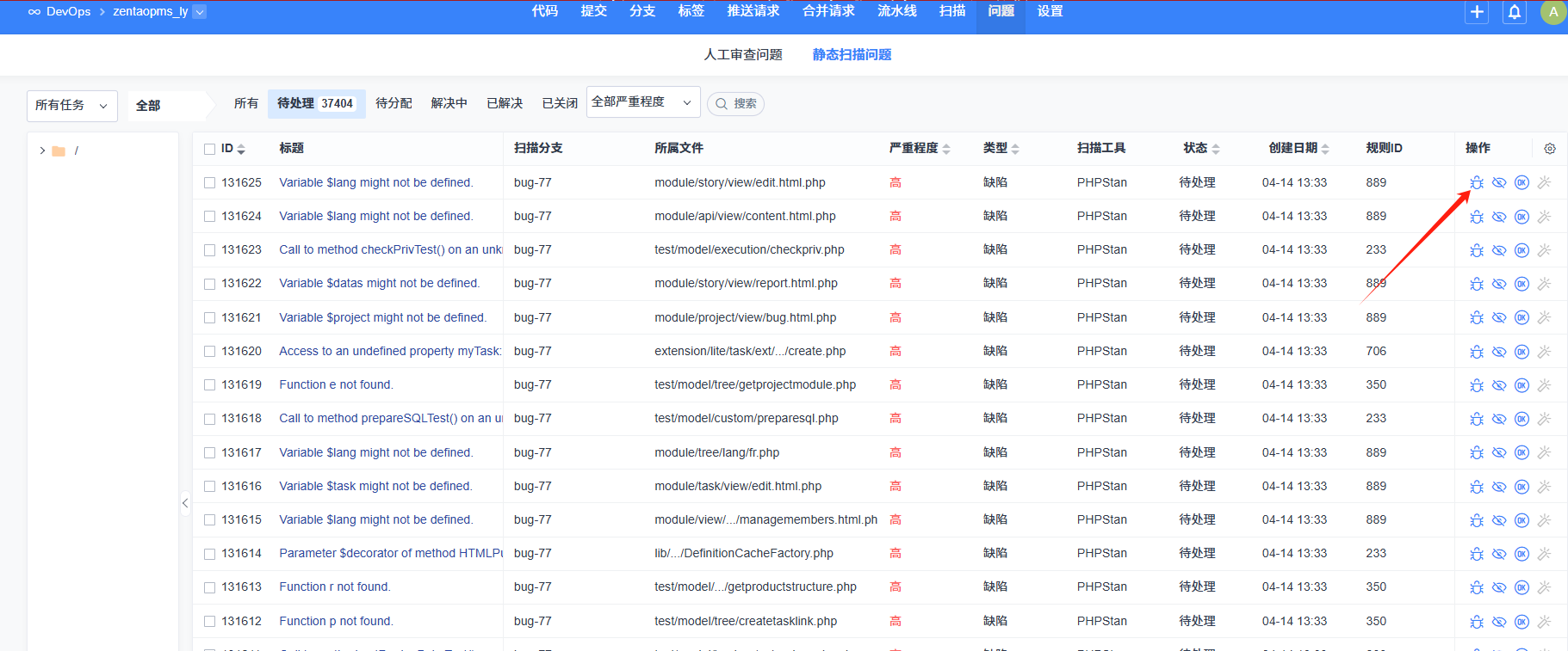 选中一个或多个静态扫描问题,点击 “转bug” 按钮,可将这些问题与禅道的测试 - Bug模块联动,自动创建对应的Bug。方便开发团队按照Bug管理流程对扫描出的问题进行跟踪和修复,确保问题得到妥善处理。