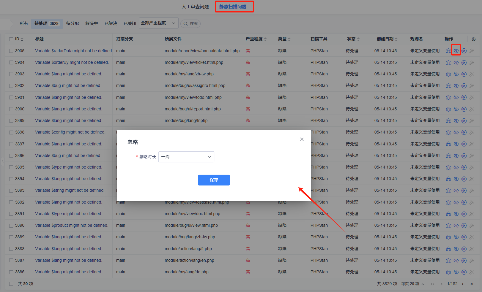 勾选需要忽略的静态扫描问题,点击 “忽略” 按钮,可选择忽略时长(如1周、2周等)。在设定的忽略时长内,这些问题将不会在待处理列表中展示。适用于一些当前阶段无需处理或已知不会产生影响的问题,避免干扰开发人员对重点问题的关注。