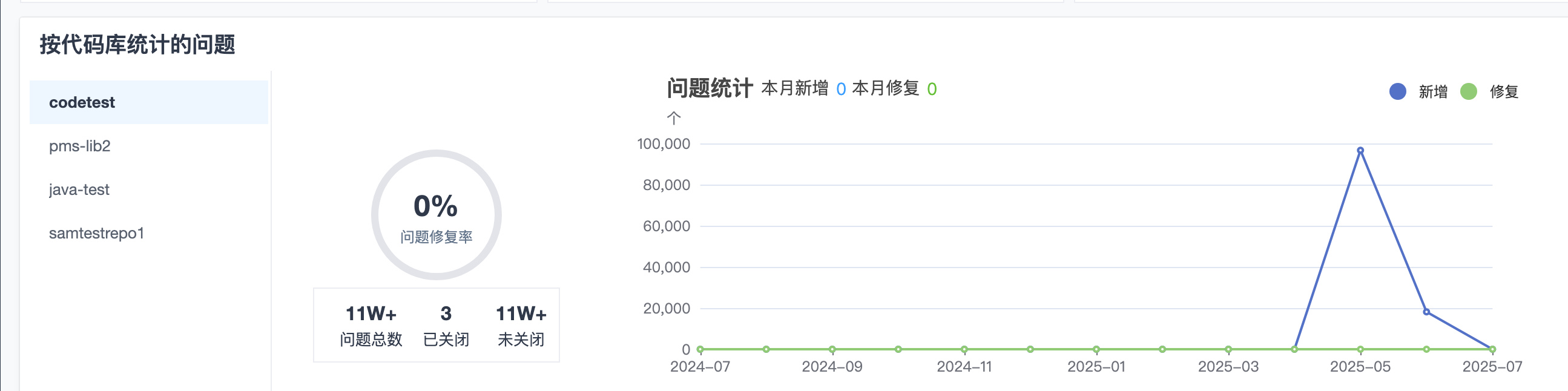 按代码库统计问题总数、修复率,追踪新增 / 修复问题趋势,聚焦特定代码库质量。