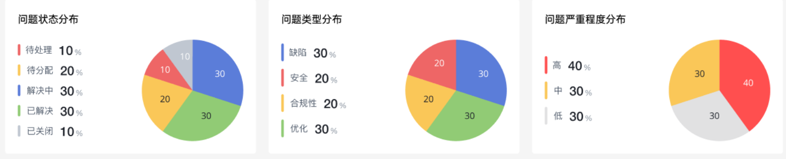 2. 分布可视化:通过饼图展示问题状态、类型、严重程度分布,直观分类问题属性 。