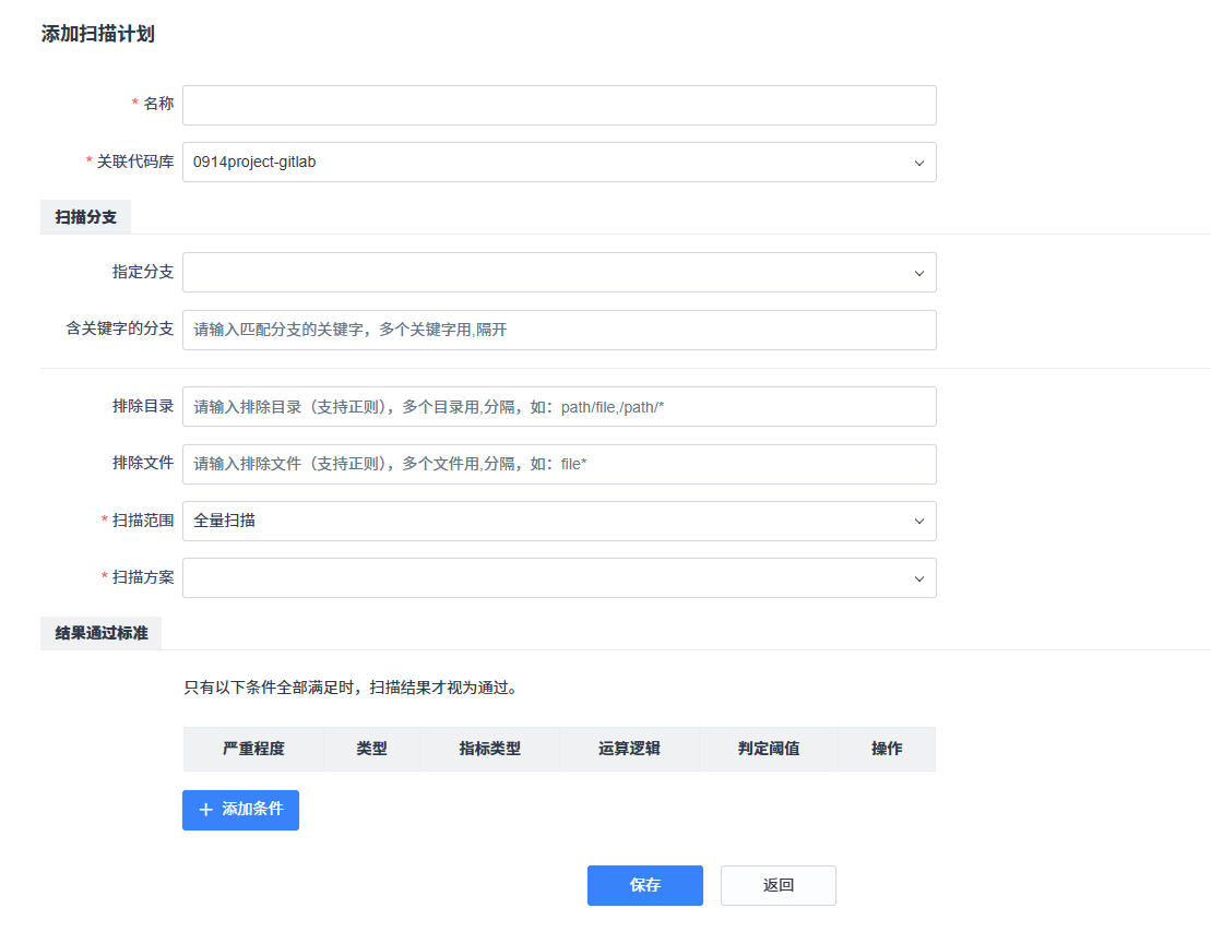 结果通过标准:点击“添加条件”按钮,手动设置条件,只有当所有条件均满足时,扫描结果才被视为通过。条件包括严重程度、类型、指标类型、运算逻辑、判定阈值等。