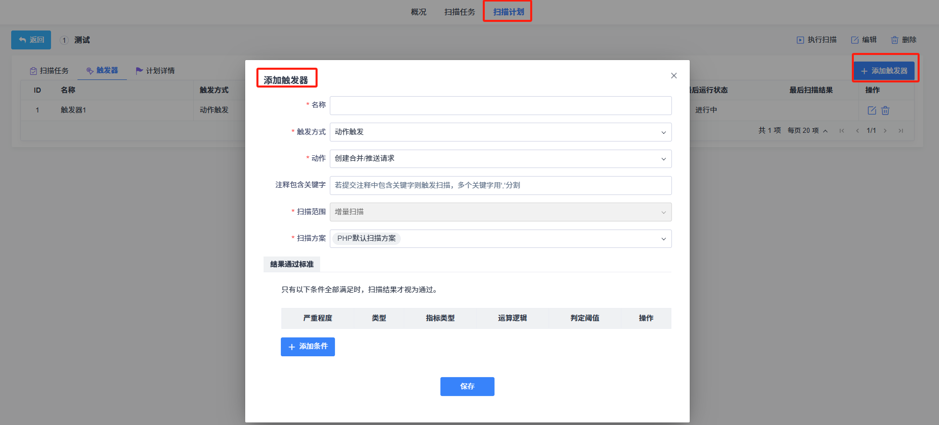 在扫描计划详情页面,点击“添加触发器”按钮,在弹出的添加触发器界面中添加相关配置参数,填写完成后,点击“保存”按钮,新的触发器即添加成功。