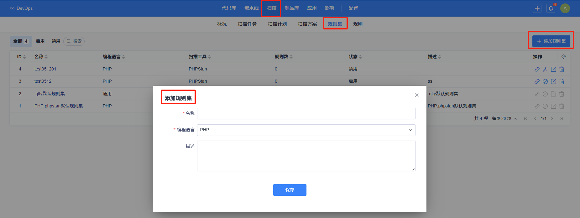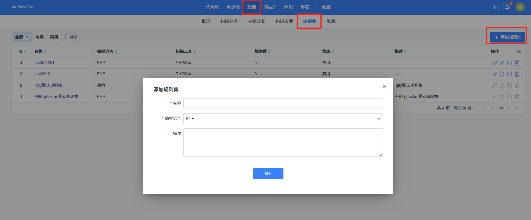点击规则集列表页面右上角的 “添加规则集” 按钮,在弹出的添加规则集界面中,依次填写:
