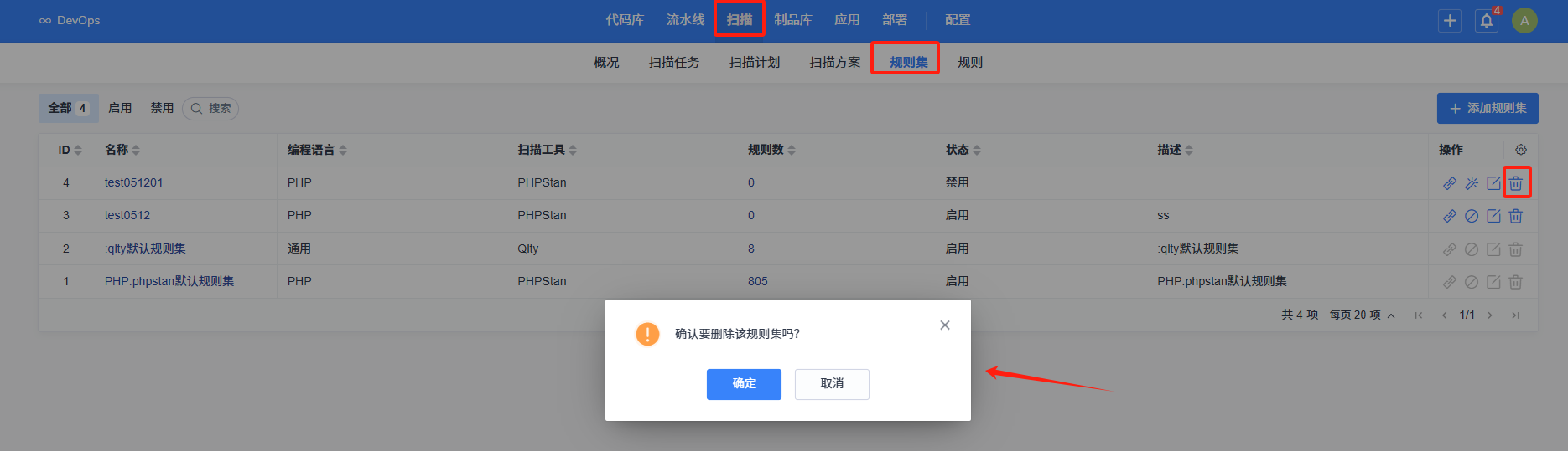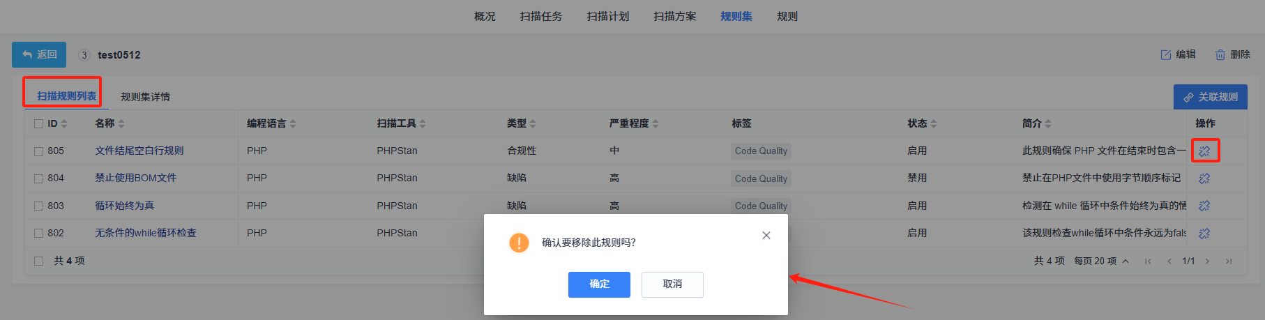 在规则集详情页的 “扫描规则列表” 中,找到想要移除的规则。在该规则对应的 “操作” 列下,点击移除图标 。此时会弹出确认移除的提示框 。若点击提示框中的 “确定” 按钮,该规则将从当前规则集中移除,后续扫描时此规则不再对代码进行检测;若点击 “取消”,则规则保留在规则集中,继续生效。