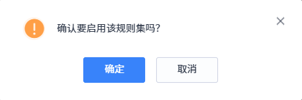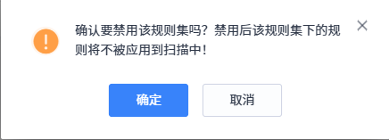 对于处于启用状态的新建规则集,在规则集列表中点击其操作栏中的禁用按钮,系统会弹出确认禁用提示框,点击 “确定”,规则集将被禁用,在后续扫描中规则集内规则不再对代码进行检测;点击 “取消”,规则集维持启用状态。默认规则集不支持启用 / 禁用操作。