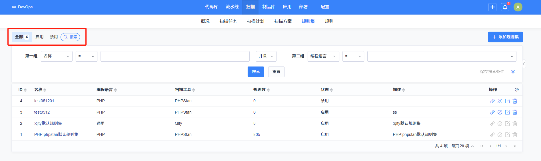 在规则列表表格上方,设有 “启用”“禁用” 的检索标签。点击相应标签,即可筛选出对应分类下的所有规则集。
